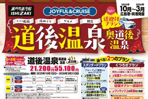 1日目 | 広島港~呉港~松山観光港→フリータイム→道後温泉または奥道後温泉(泊) | 夕食1回 (道後hakuro除く) |