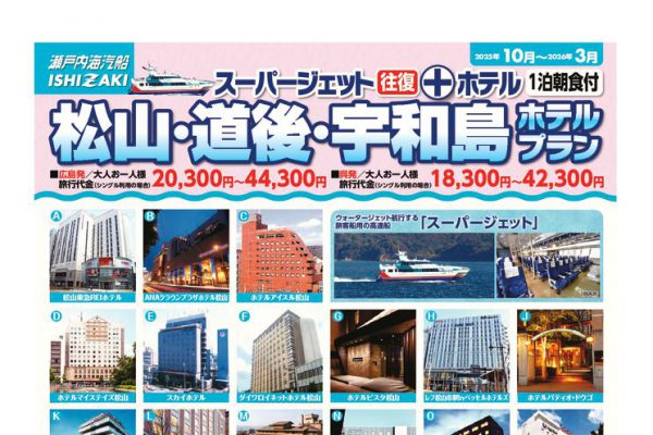 スーパージェットは広島港と松山港を最短70分で結びます。スクリューを使わず、高出力(2500馬力x2)のウォータージェットを使用することにより、高速航行を可能にしています。ホテルとのセットでビジネスにはもちろん、ご旅行にも大変便利です。