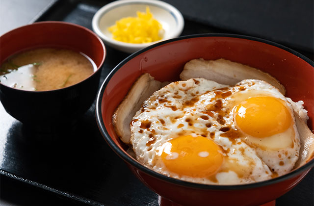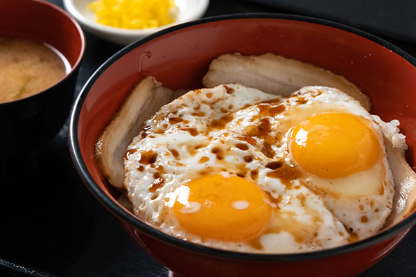 - 愛媛県今治市が発祥の大人気B級グルメ!ご飯の上にチャーシューをのせ、さらに半熟の目玉焼きをのせてから焼豚のタレで味付けした丼物です!